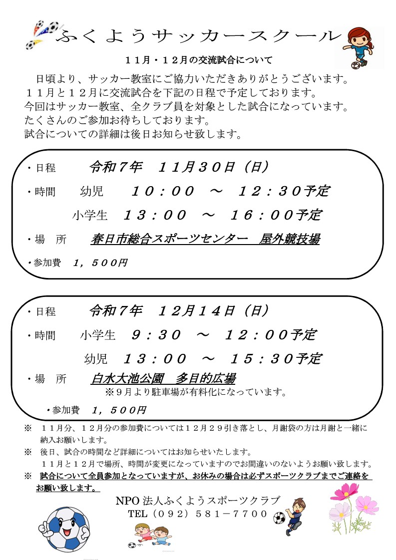 ★令和7年12月14日(日) サッカースクール 白水大池公園 多目的広場 ★令和7年11月30日(日) サッカースクール 春日市総合スポーツセンター 屋外競技場 ★令和7年10月19日(日) 秋のバスハイキング