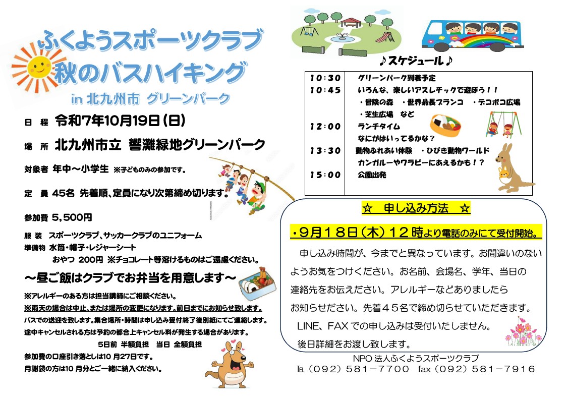 ★令和7年12月14日(日) サッカースクール 白水大池公園 多目的広場 ★令和7年11月30日(日) サッカースクール 春日市総合スポーツセンター 屋外競技場 ★令和7年10月19日(日) 秋のバスハイキング