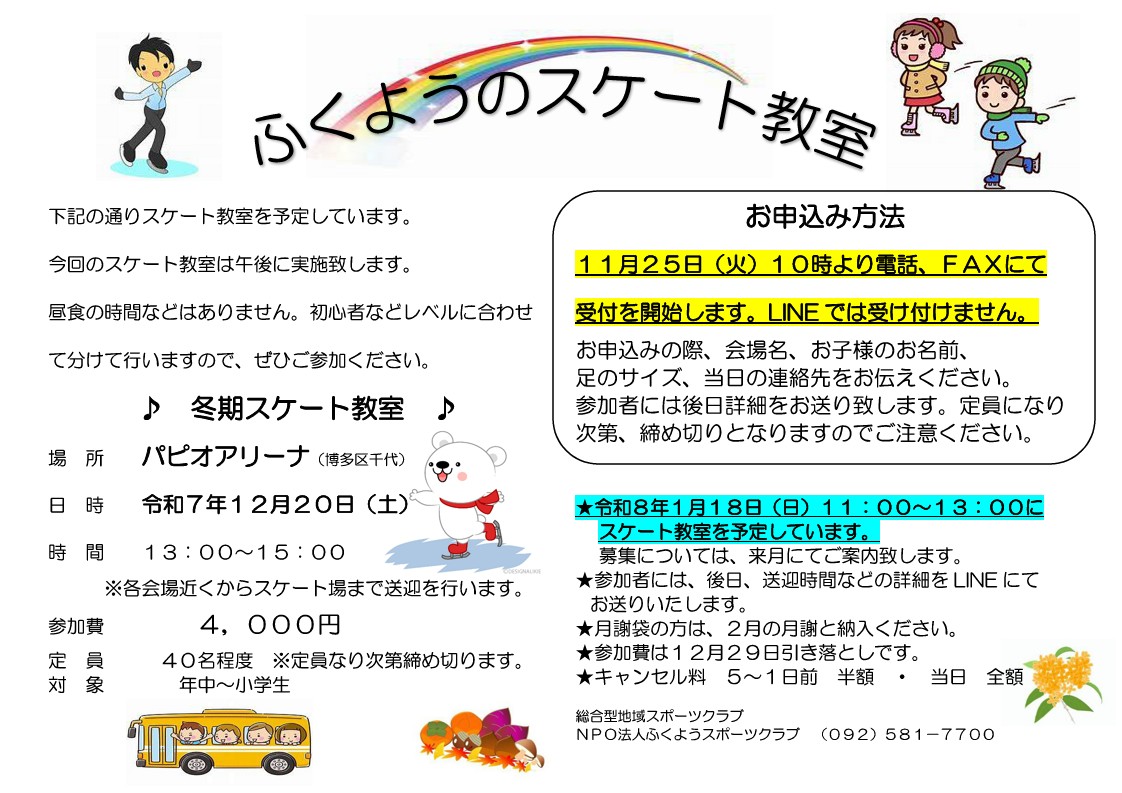 ★令和7年12月20日(土) スケート教室 パピオアリーナ ★令和7年12月14日(日) サッカースクール 白水大池公園 多目的広場 ★令和7年11月30日(日) サッカースクール 春日市総合スポーツセンター 屋外競技場